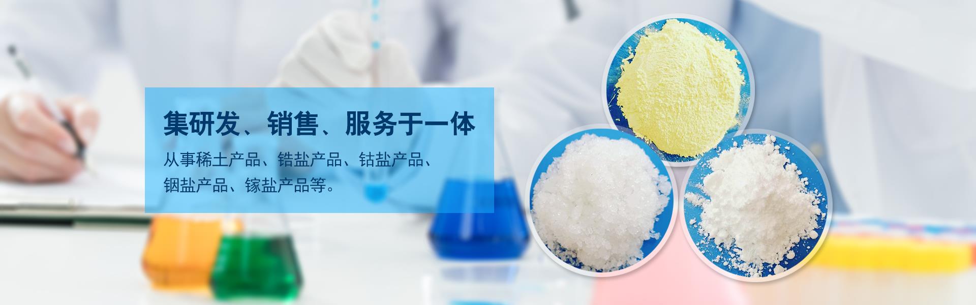 公司從事醫藥中間體,石油催化,有機合成,油田采油領域研發以及無水氯化鹽類產品,化工原料、中間體的銷售、服務,得到了較強的市場競爭力和較高的市場口碑。主要產品分為五大系列:一,稀土系列(稀土氧化物、稀土硝酸鹽、稀土碳酸鹽、稀土氯化鹽、稀土硫酸鹽、稀土醋酸鹽、稀土草酸鹽、稀土氟化物);二,鋯系產品(硝酸鋯、氧化鋯、醋酸鋯、氧氯化鋯、碳酸鋯):三,鈷系產品(硫酸鈷、硝酸鈷、氧化鈷、碳酸鈷、氫氧化鈷);四,銦系產品(硝酸銦、氯化銦、氧化銦、氫氧化銦);五,鎵系產品(硝酸鎵、氯化鎵、氧化鎵)。
